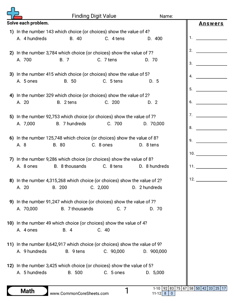 Each worksheet has 12 problems finding the value of a digit within a larger number.